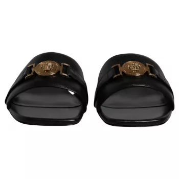 VERSACE Black Leather Logo Plaque Slides Sandals with Gold Detailing